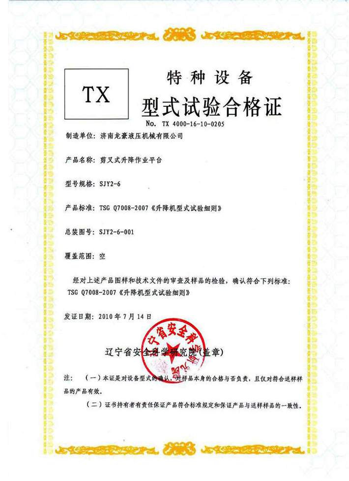 移動(dòng)剪叉液壓升降機(jī)合格證
